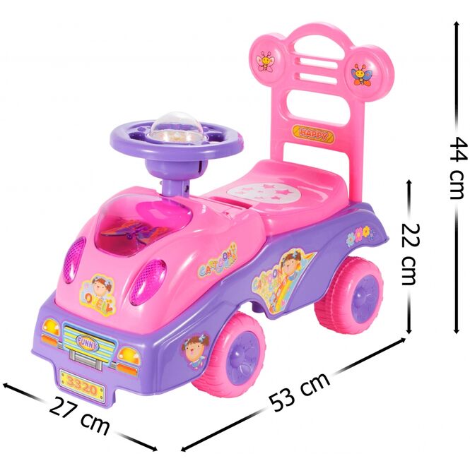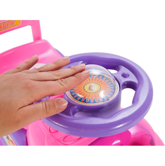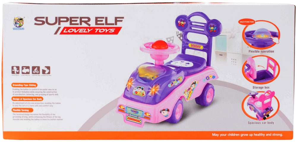 Очарователна бебешка кола за бутане Super Elf в розово и лилаво – идеална за първите приключения у дома. Комфортна седалка, стабилна конструкция и лесно управление чрез волан с музикални ефекти. Задната облегалка осигурява допълнителна опора, а под седалката има практично място за съхранение на малки играчки.