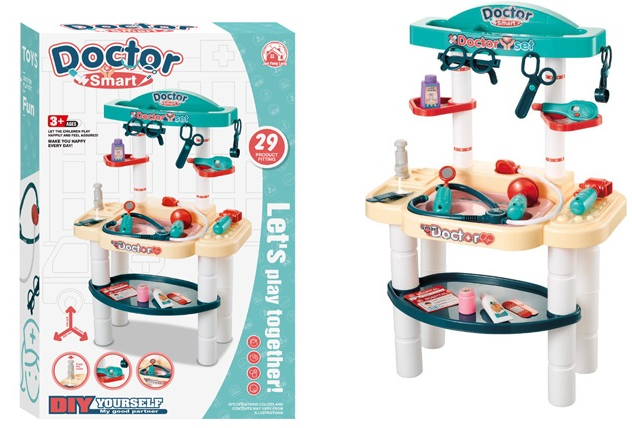 Състои се от медицинска маса и 29 реалистични аксесоара, сред които стетоскоп, термометър, спринцовка, очила, ножица и други инструменти, които ще направят играта още по-интересна.