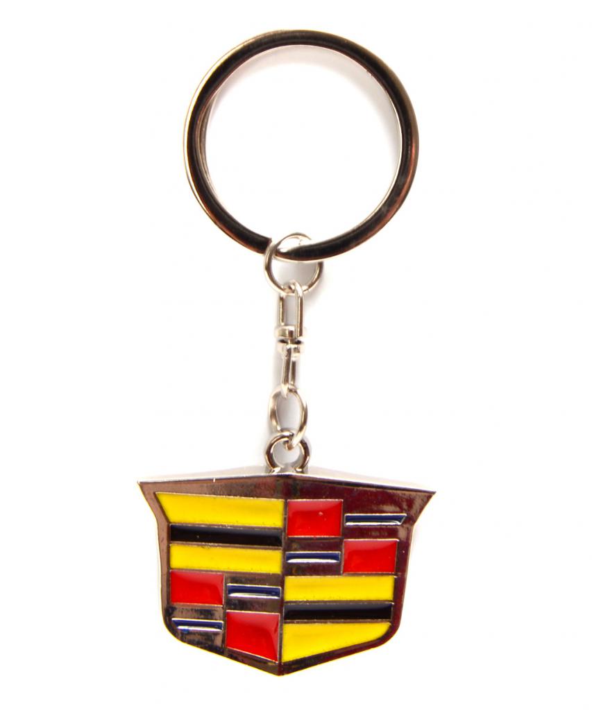 Елегантен метален ключодържател в стил Cadillac с характерната многоцветна емблема.