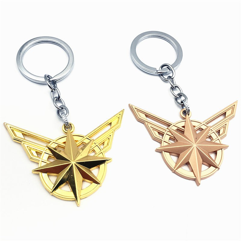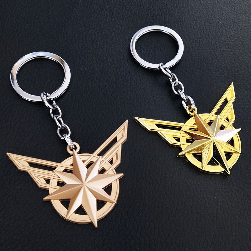 Метален ключодържател в стил Captain Marvel с елегантен дизайн и звездовиден символ. Подходящ за фенове на супергерои, колекционери или като стилен аксесоар за ключове и раници.