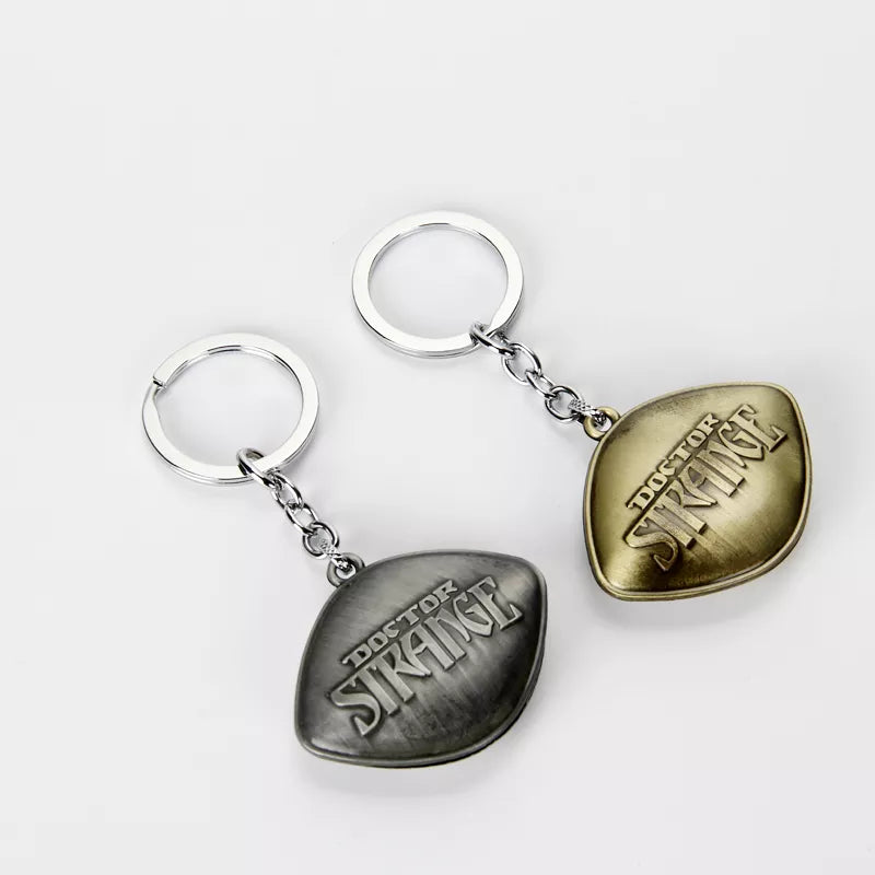 Метален ключодържател в стил Doctor Strange с дизайн на Eye of Agamotto и релефен надпис. С детайлна изработка и зелен камък в центъра, този аксесоар е идеален за фенове на Marvel, колекционери или като оригинален подарък.