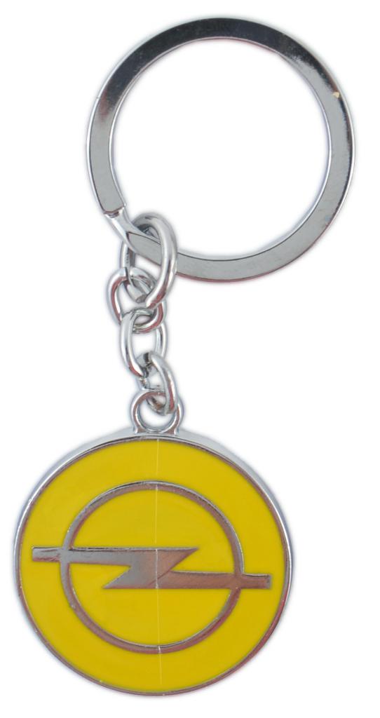 Метален ключодържател Opel с кръгла жълта емблема – елегантен и практичен аксесоар за вашите ключове.