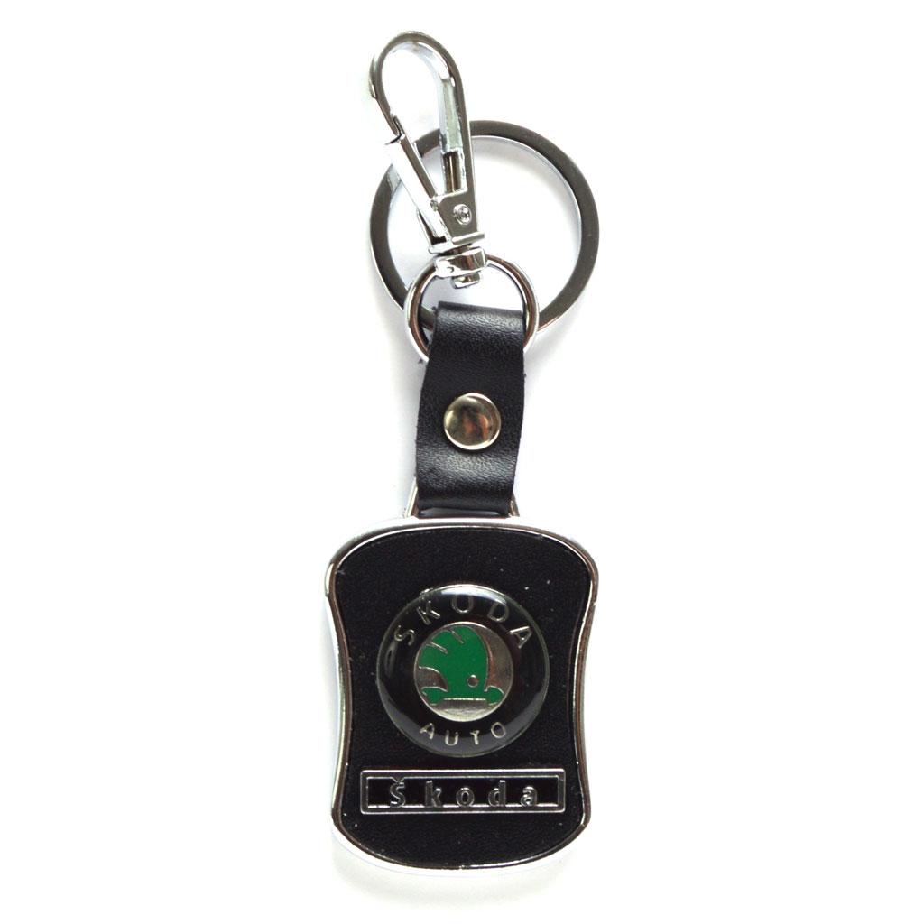 Елегантен ключодържател Skoda с правоъгълна метална плочка и изкуствена кожа.