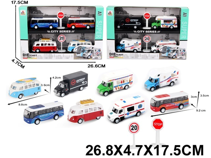 Комплект метални автобуси City Series – 4 броя с пътни знаци