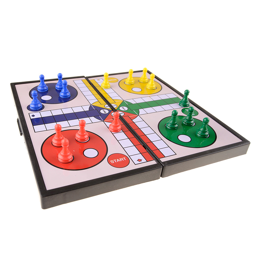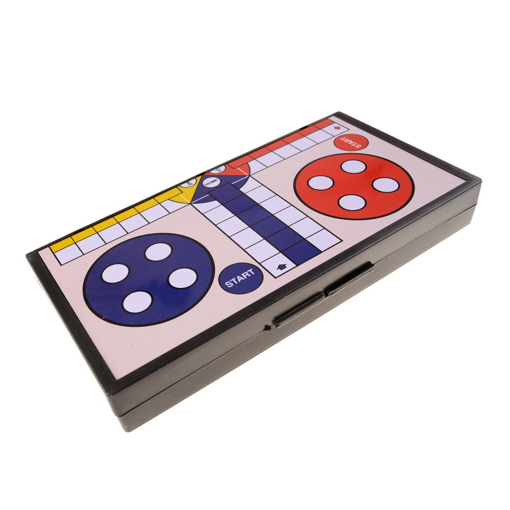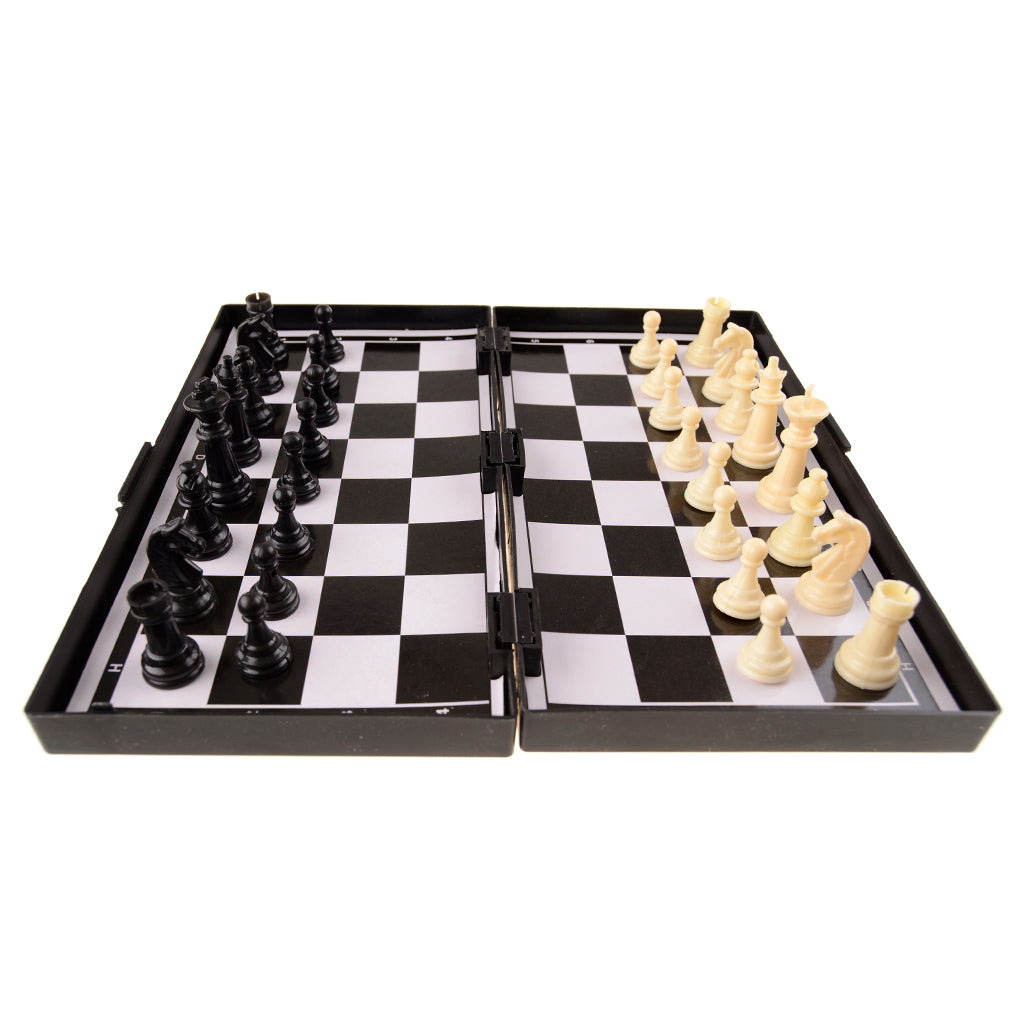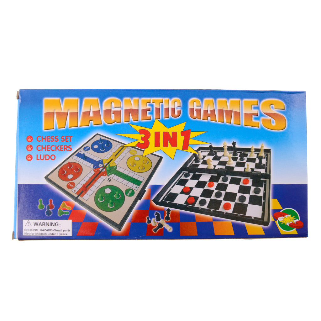 Магнитен комплект 3 в 1 - шах, "Не се сърди човече" и морски шах в PVC кутия, удобен за питници или за плажа.
