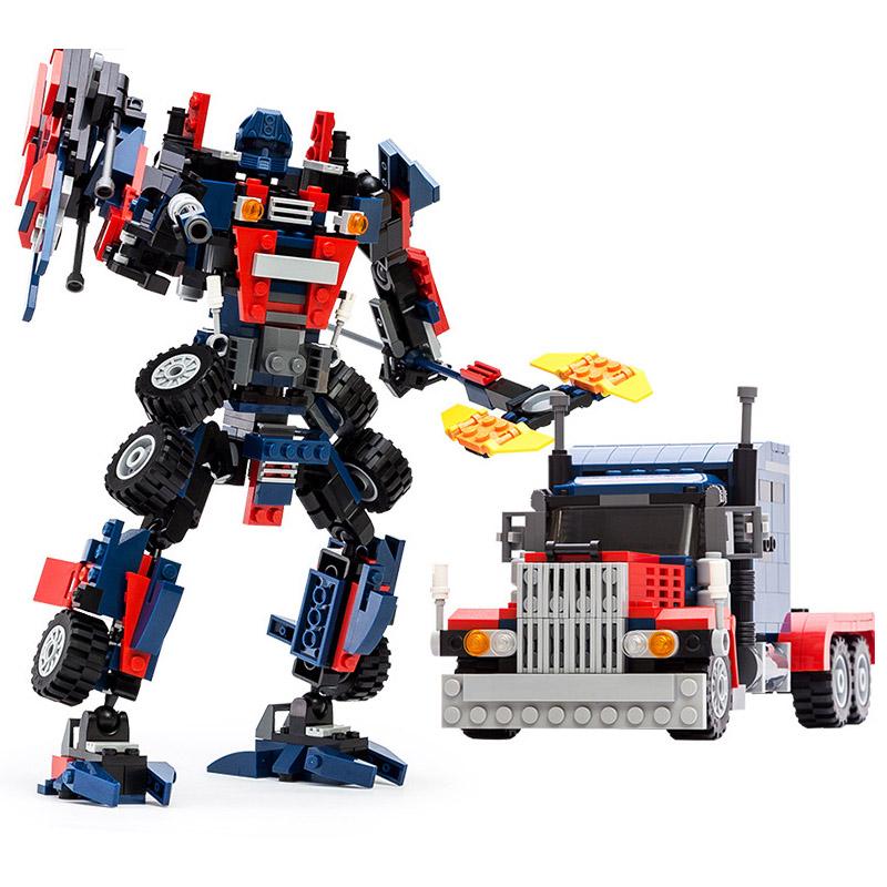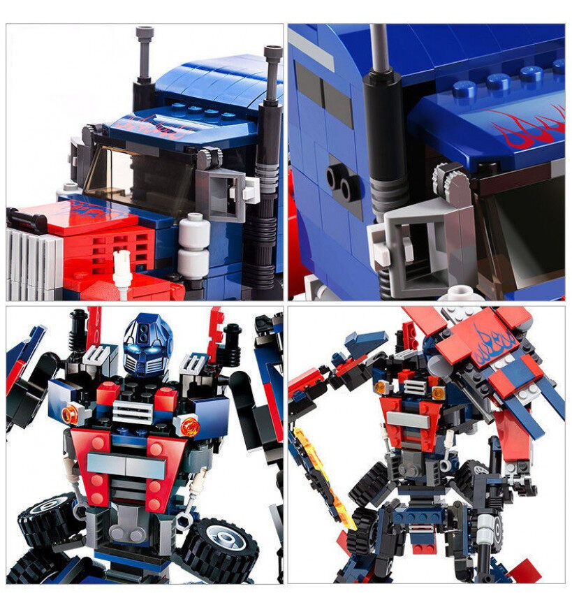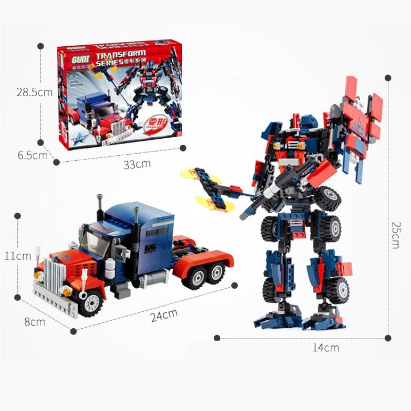 Комплектът включва впечатляващ модел, който може да се трансформира от тир в робот – с подвижни ръце, крака и оръжие.