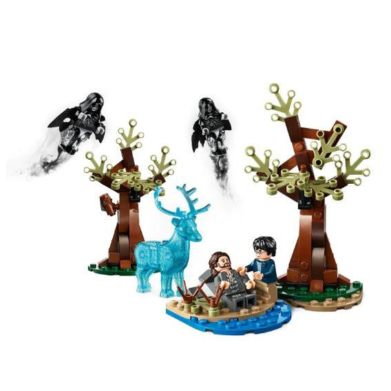Комплектът включва мини фигурки на млади магьосници, дементори и мистичен елен-покровител, както и дървета и терен за сцената. Перфектен избор за фенове на фентъзи вселени и конструктори тип блокчета.