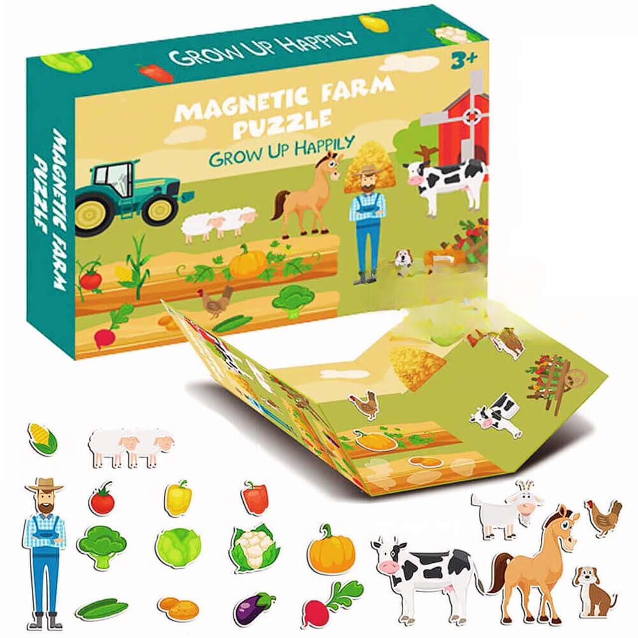 Този магнитен пъзел съчетава игра и учене — детето подрежда животни, фермер и зеленчуци върху удобна разтваряща се магнитна основа.