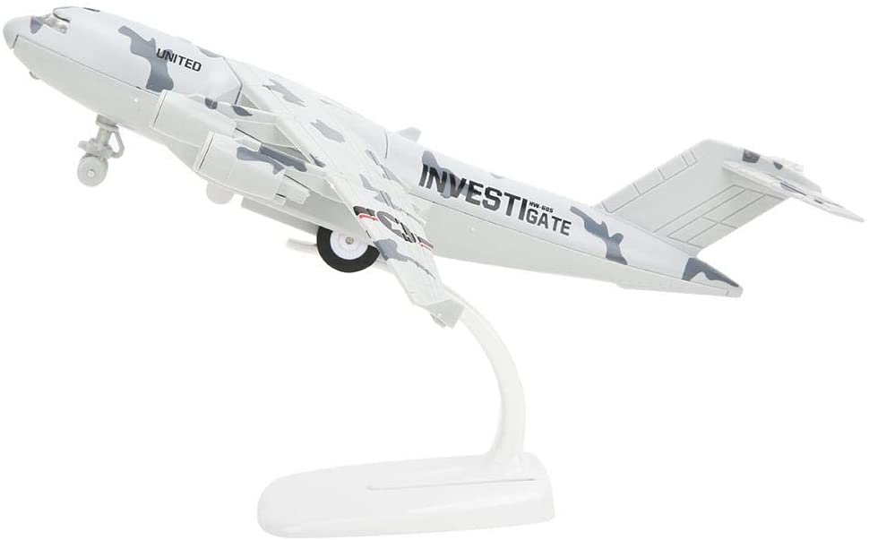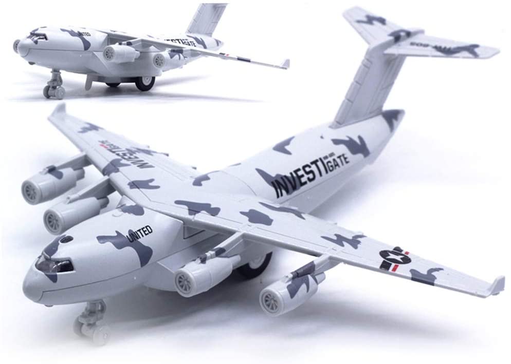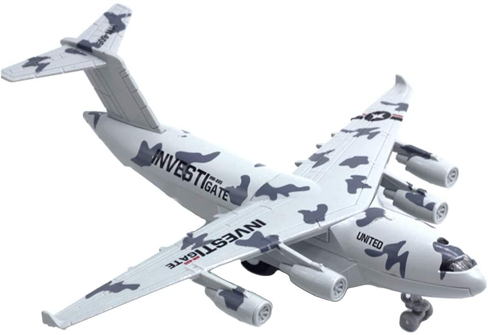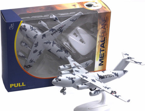 Метален военен самолет в сив камуфлаж, идеален както за игра, така и за витрина в колекцията. Четири двигателя, масивен фюзелаж и надписи INVESTIGATE придават много реалистичен вид, а светлините и звуковите ефекти правят модела още по-ефектен.