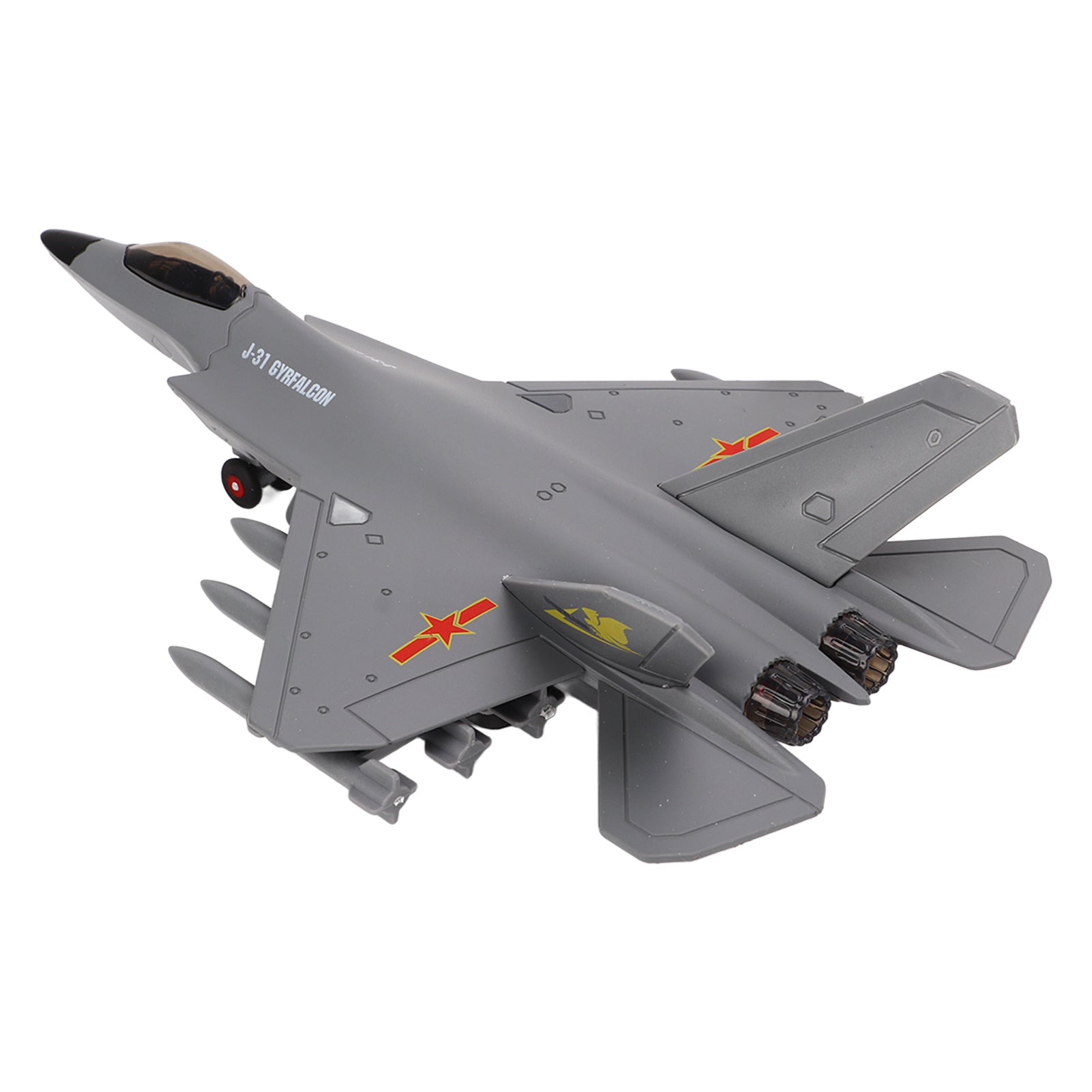 Този модел на J-31 Gyrfalcon носи усещане за истински реактивен изтребител – широка „stealth“ форма, ракети под крилата и ефектни светлини по корпуса. Подходящ е както за ежедневна игра, така и като готин акцент в колекцията на любителите на самолети и военна техника.