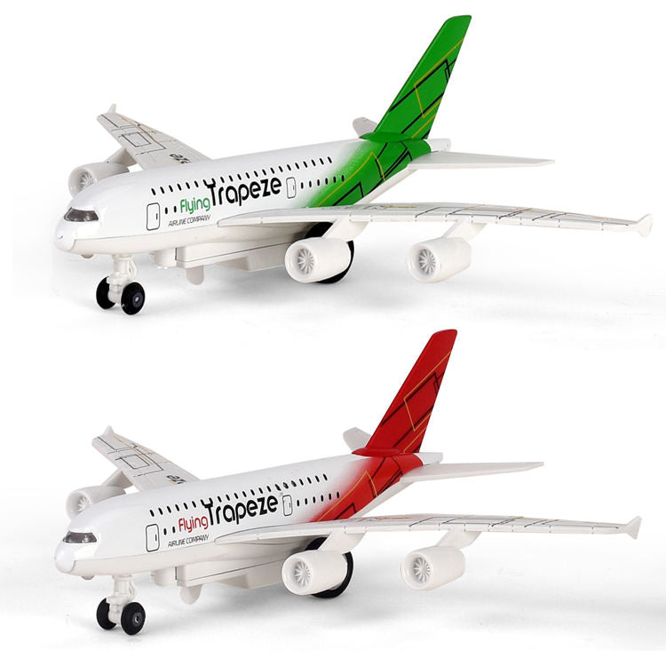 Метален модел на пътнически самолет с модерна окраска Flying Trapeze, светлини, звуци и pull-back механизъм – готов за излитане директно от детската стая или от витрината.