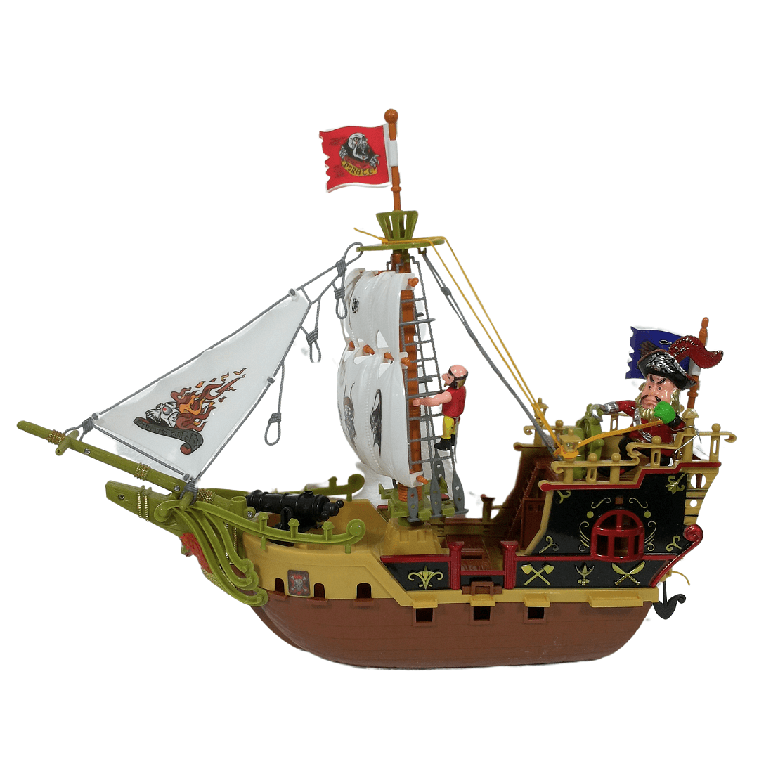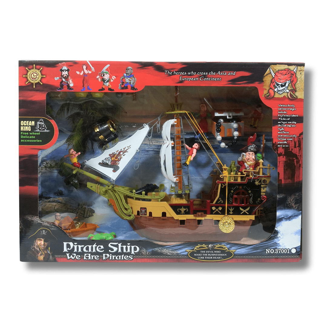 Корабът е с красиво декорирани платна и включва пиратски фигурки, лодка, съкровища и тематични аксесоари.