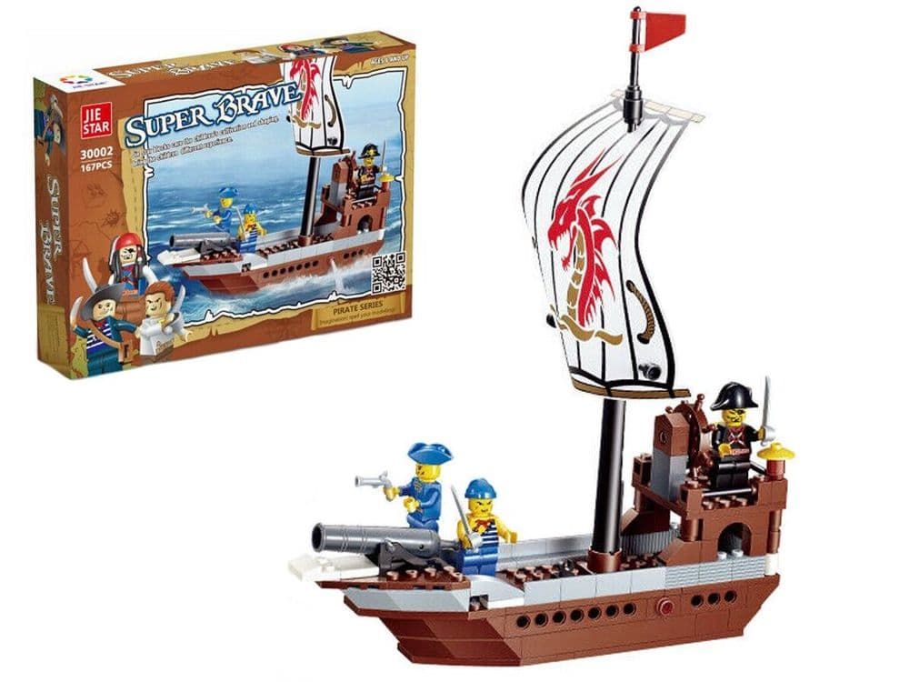 Комплектът съдържа 167 части, с които можеш да построиш детайлен пиратски кораб с оръдие, платна с червен дракон и фигурки на смели пирати.