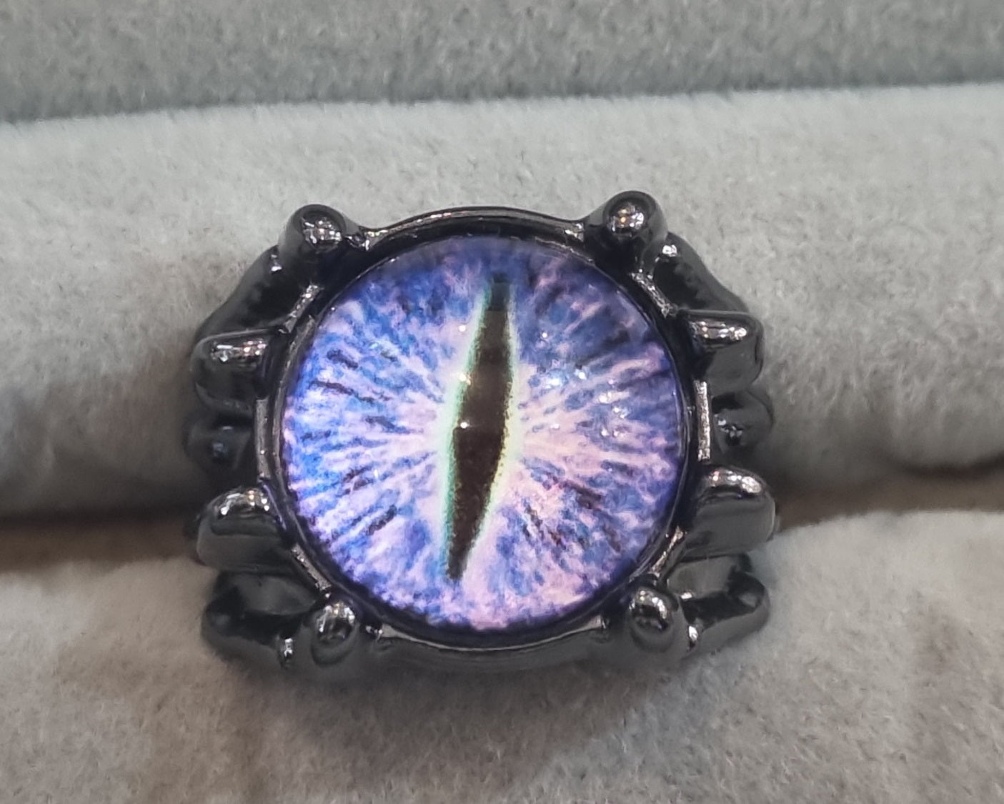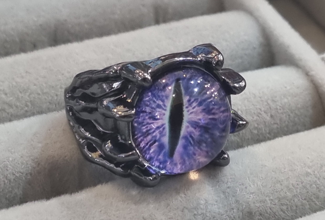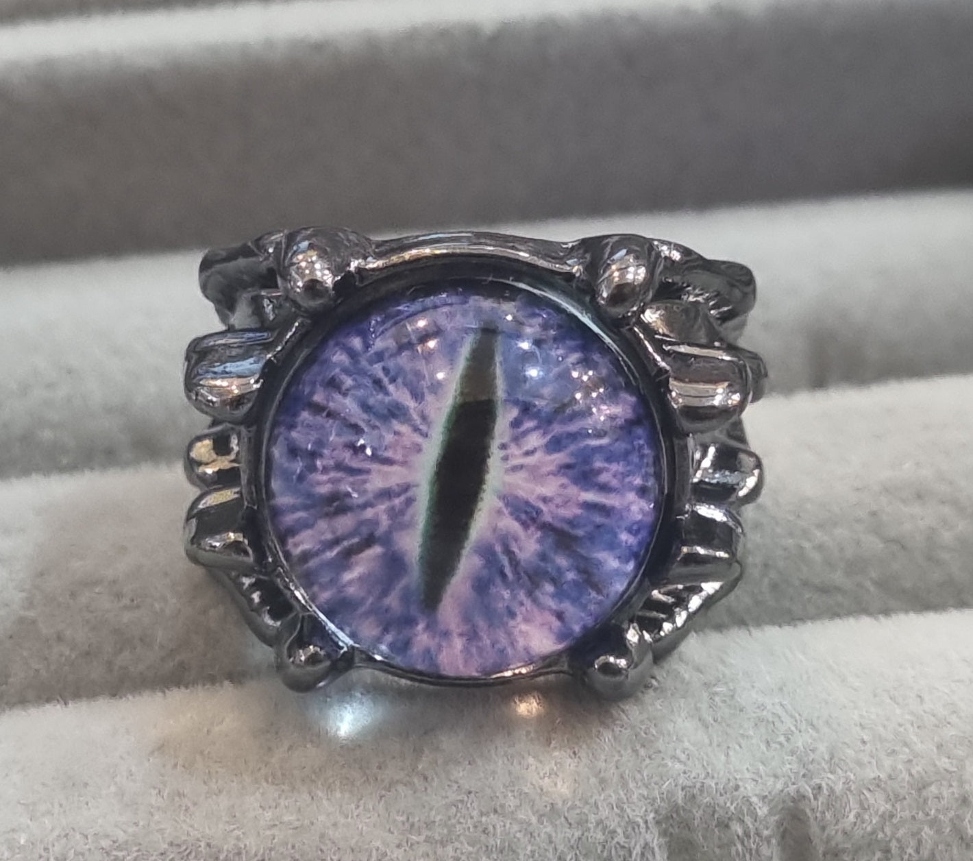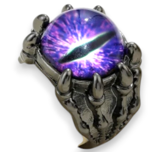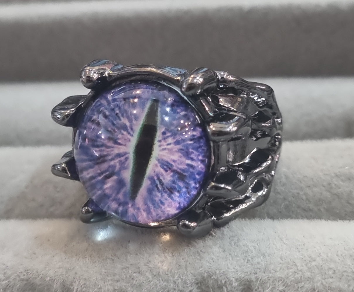 Този пръстен с драконово око е впечатляващ аксесоар, който веднага се отличава. Масивната форма и мистичното „око“ със силен лилав оттенък го правят идеален за хора, които обичат нестандартните детайли.