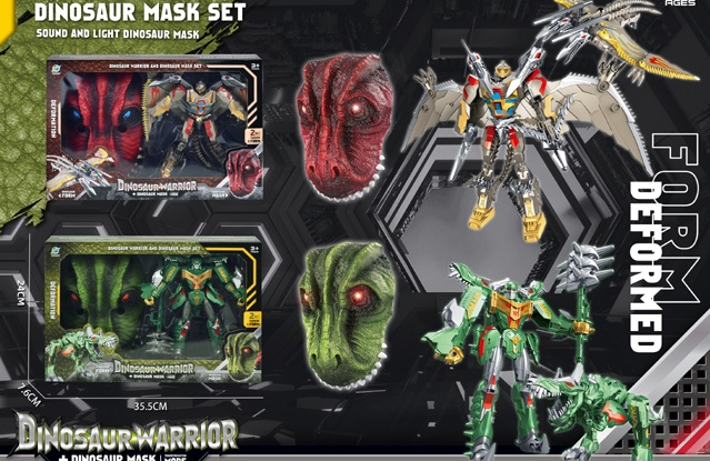 Dinosaur Warrior Set включва трансформиращи се роботи и реалистична динозавърска маска със звук и светлинни ефекти. Подходящ за деца, които обичат динамични игри и вълнуващи битки.