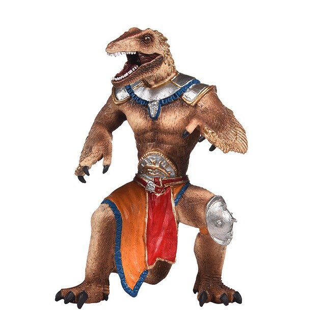 Мощна и детайлна фигура на динозавър воин, която впечатлява с бойна броня и реалистичен дизайн. Подходяща е както за игра, така и за декорация. Изработена е от качествен материал с прецизни детайли, които придават автентичен вид.