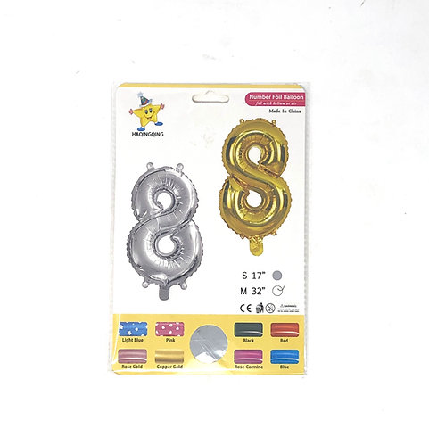 Фолиев балон във формата на цифра 8 – стилен и ефектен елемент за всяка празнична украса. Перфектен за рождени дни, годишнини, тематични партита и снимки. Балонът има красив металически блясък, стои стабилно и се комбинира добре с други цифри и цветове.