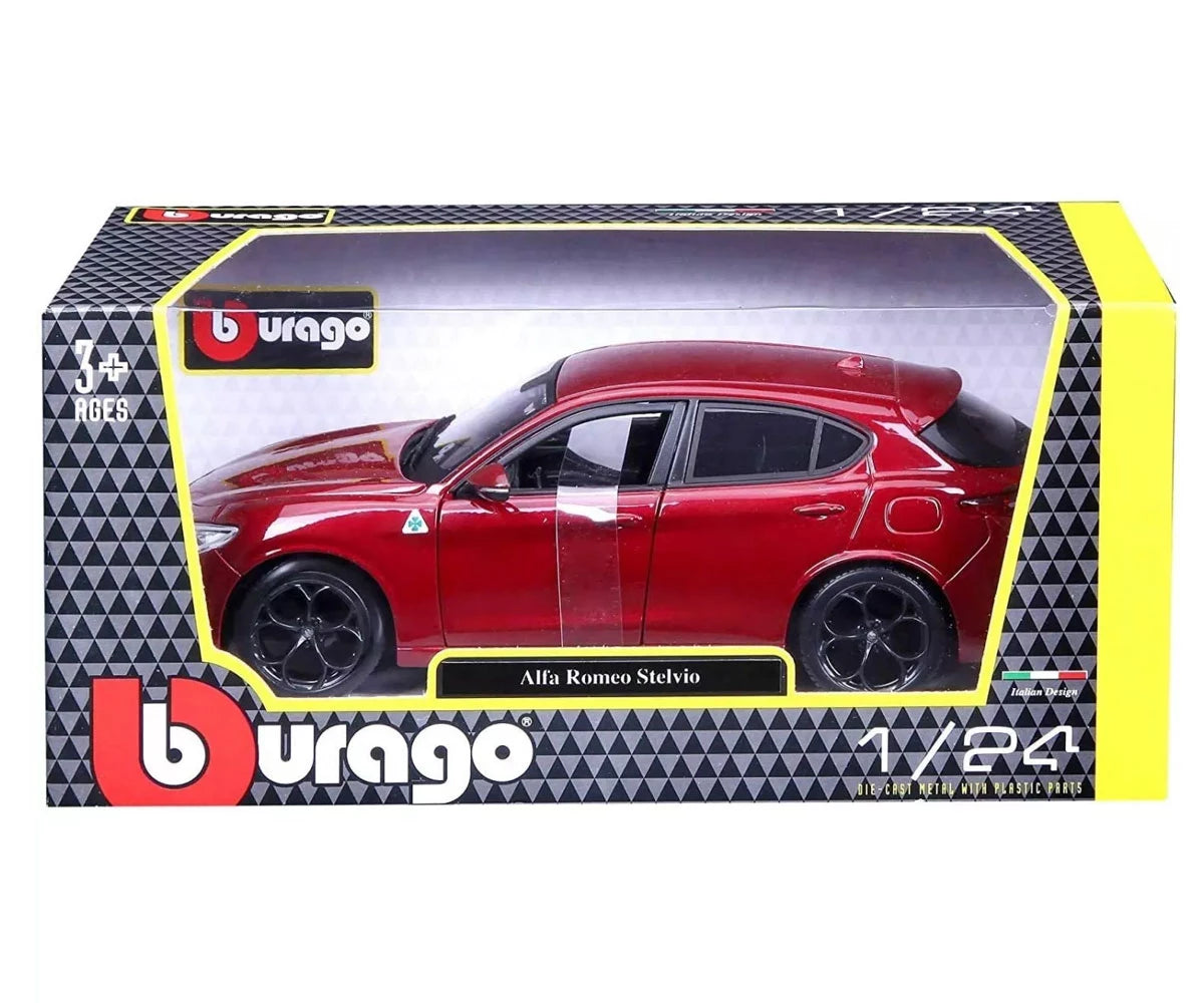 Прецизно изработен модел на Alfa Romeo Stelvio в мащаб 1:24, част от серията Bburago Plus. Количката впечатлява с реалистични детайли, автентична форма и лъскаво червено покритие, което подчертава италианския стил и динамика на оригинала.
