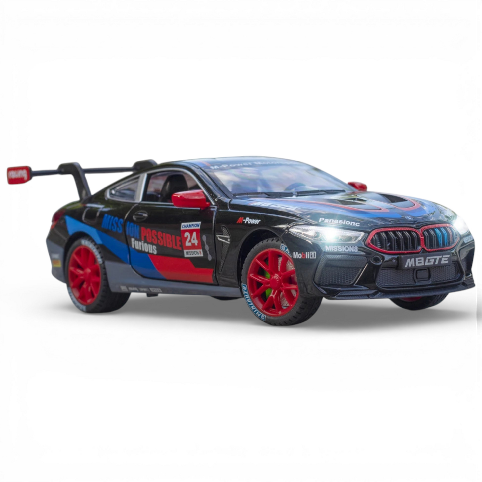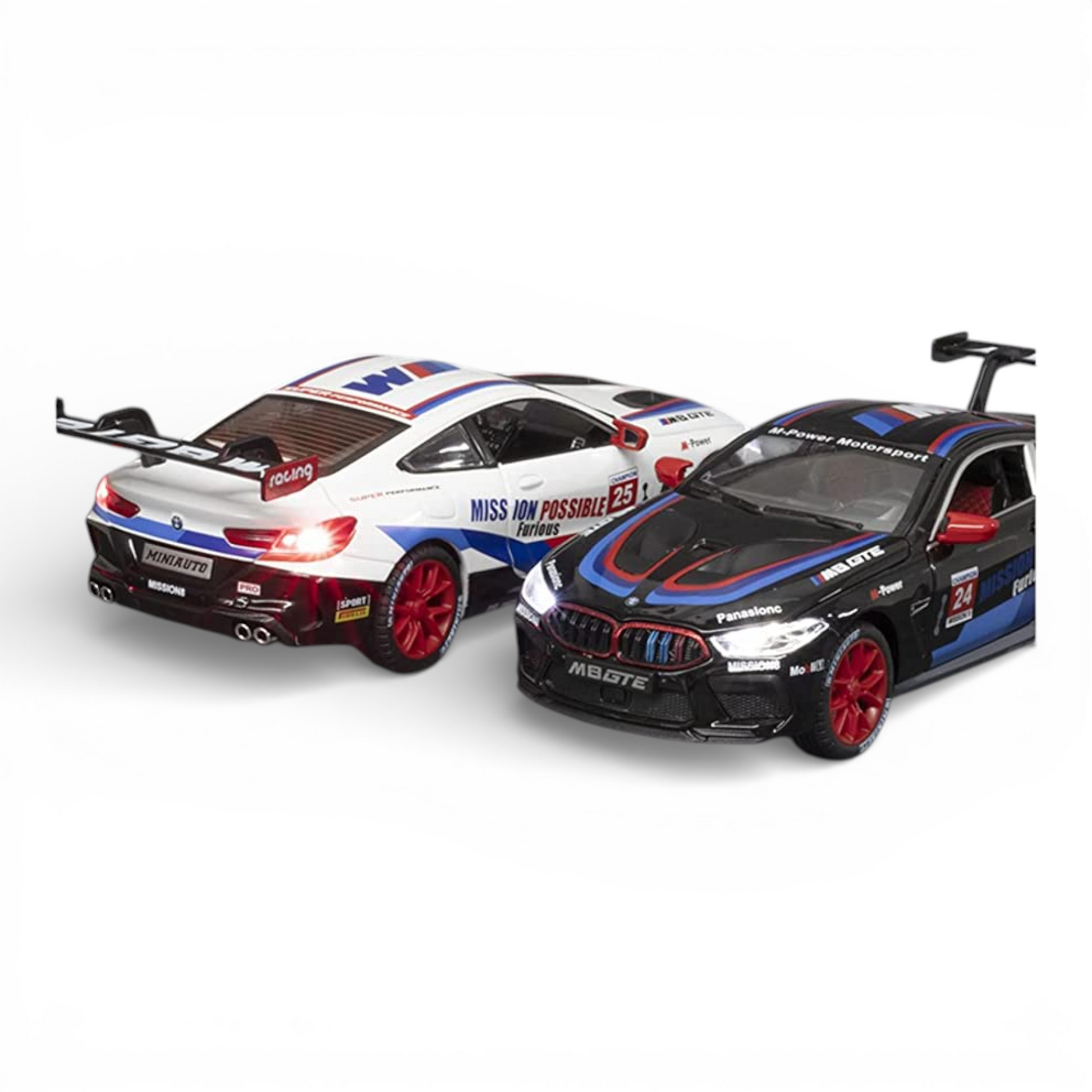 BMW M8 GTE – състезателна машина с агресивен дизайн и силно присъствие, пресъздадена в детайлен метален модел.