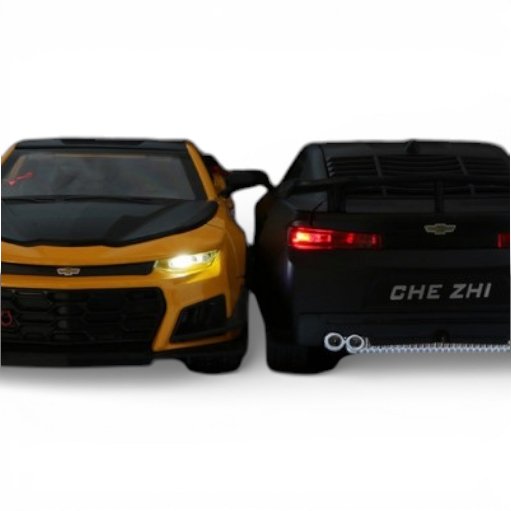 Chevrolet Camaro, събран в 1:24 мащаб – агресивно спортно купе за всички фенове на muscle cars. Металният модел идва с ефектни детайли, LED светлини и звук, които се активират при натиск – идеален за рафт, бюро или витрина.