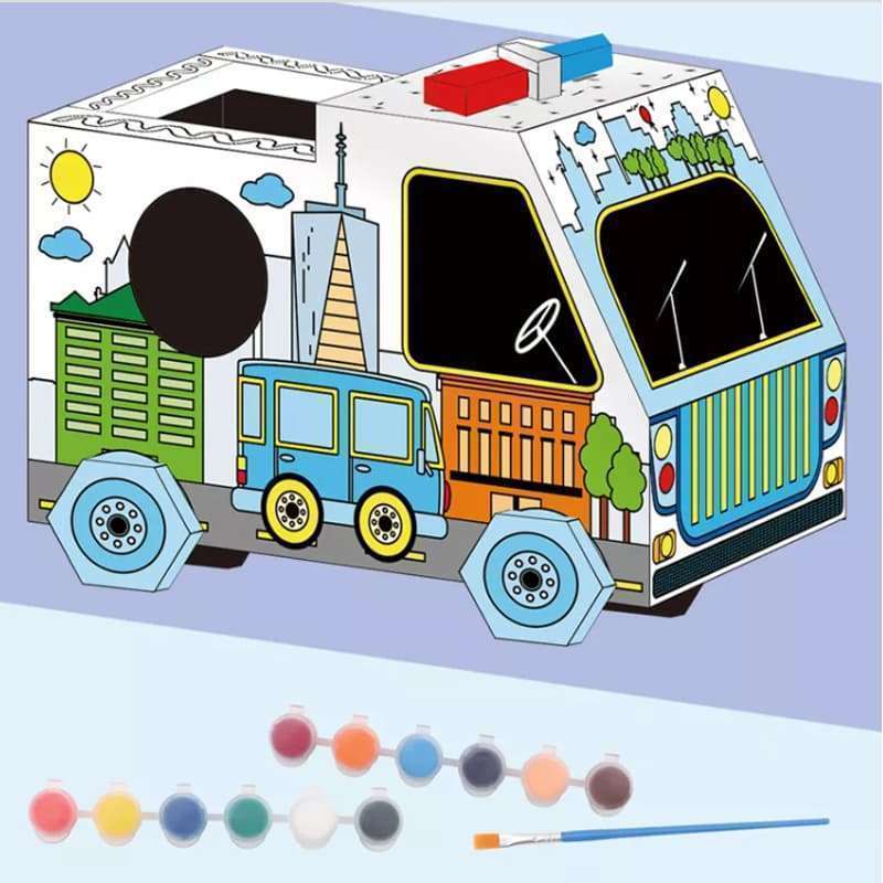 Забавен DIY картонен камион, който детето оцветява и персонализира с включените бои и четка. Лек, сглобяем и идеален за творчески игри у дома.