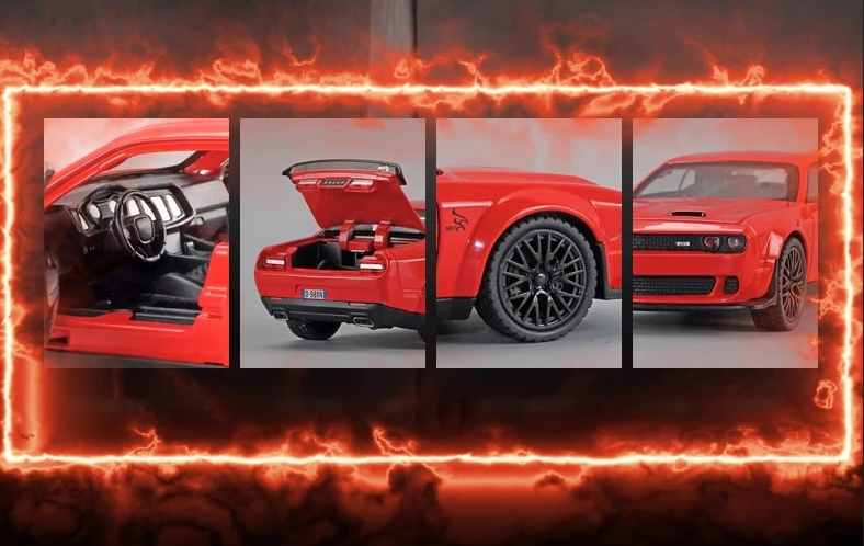 Този Dodge Challenger SRT в мащаб 1:32 е перфектно изработен с внимание към детайлите – от характерната спортна решетка до LED фаровете, които светят при натиск. Звуковите ефекти добавят още повече реализъм, което го прави истински впечатляващ модел.
