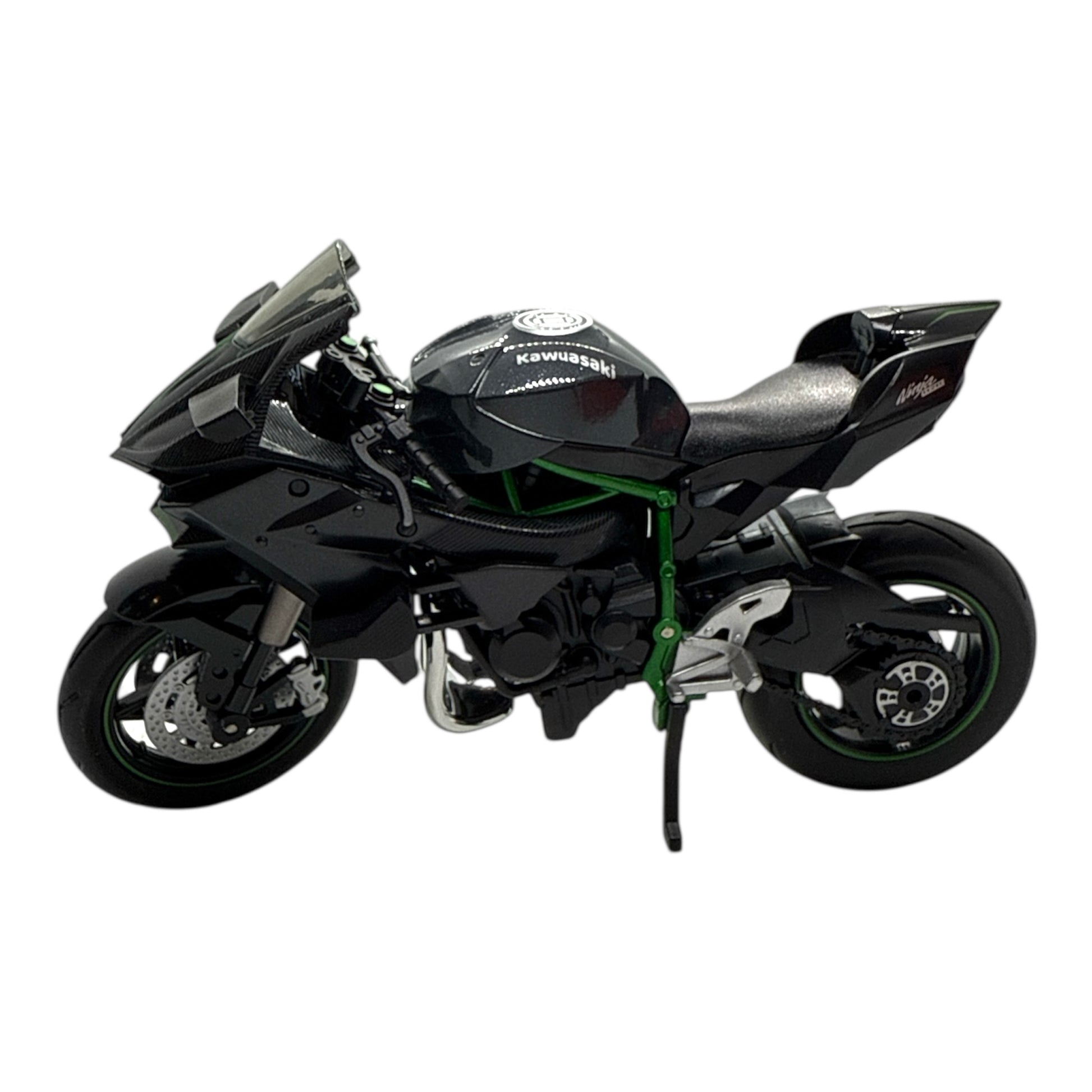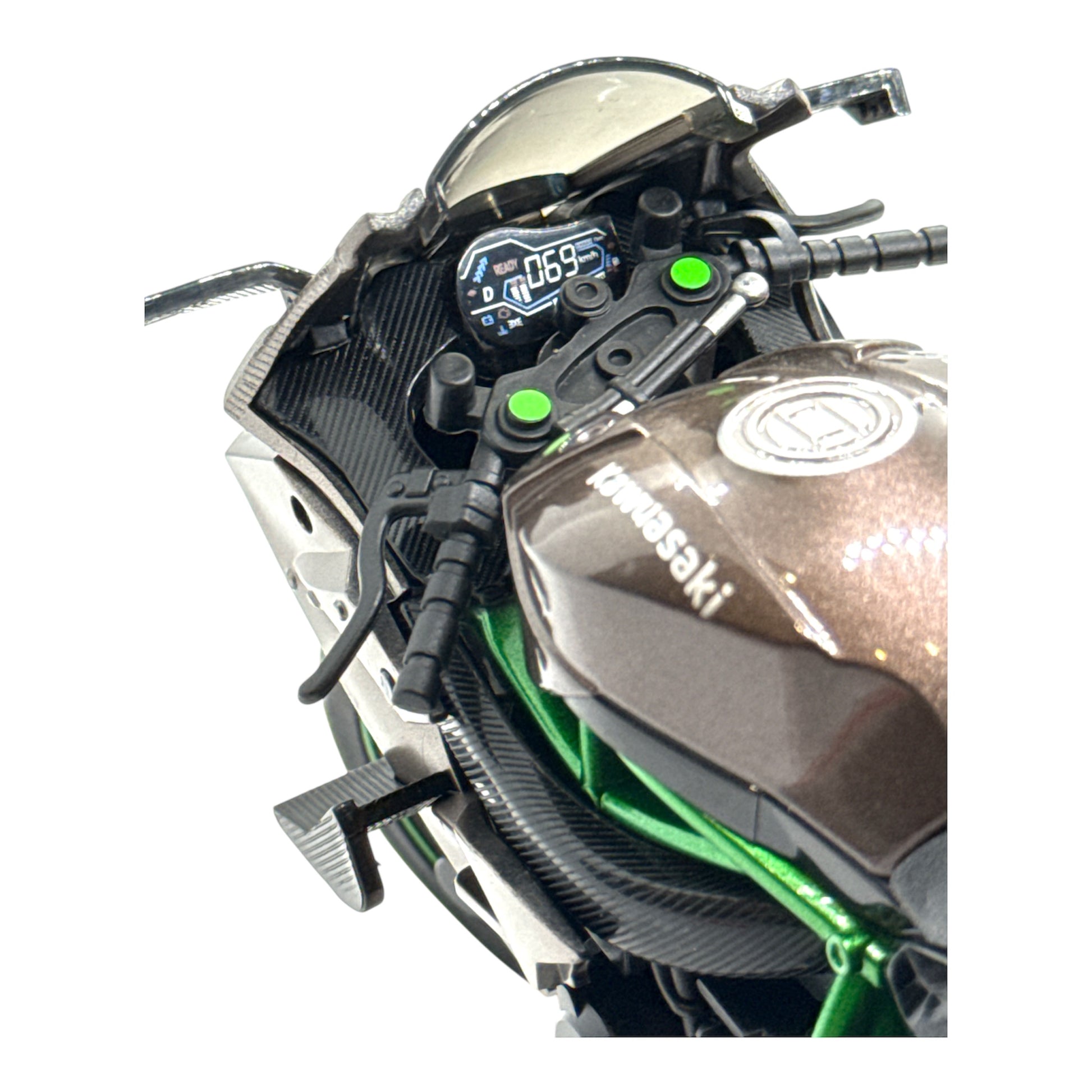 Металният модел Kawasaki Ninja H2R в мащаб 1:12 съчетава впечатляваща визия, динамика и внимание към всеки детайл. Корпусът е изработен от метал, а конструкцията пресъздава агресивния дизайн на легендарния H2R – от спортната предница до зеления тръбен рамков елемент.