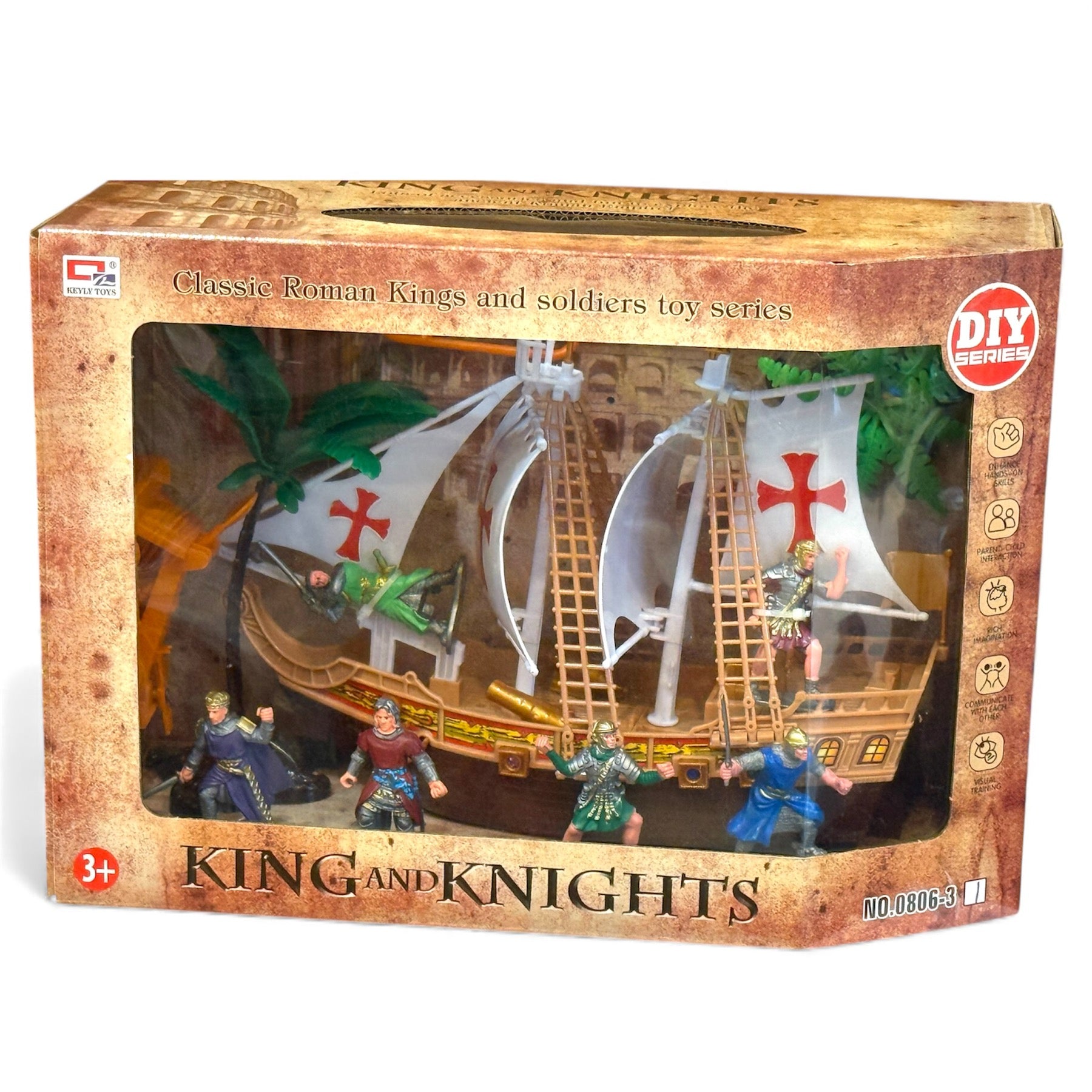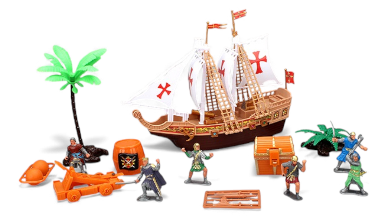 В кутията ще откриеш детайлен кораб с платна и червени кръстове, палуби и стълби, палми и аксесоари, както и няколко фигурки на рицари/войни в различни пози. Децата могат да пресъздават исторически сцени, да измислят свои истории за крале, рицари и завоевания и да комбинират комплекта с други фигурки и играчки.