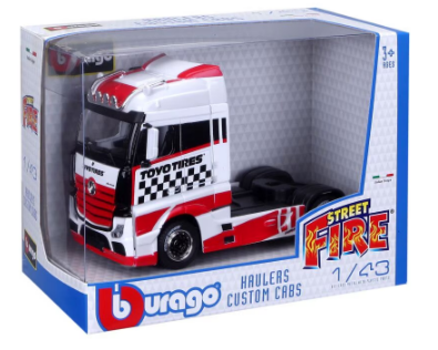 Метален модел на легендарния Mercedes-Benz Actros Gigaspace Toyo Tires в мащаб 1:43 – част от серията Bburago Street Fire Haulers Custom Cabs. Много хубав камион за колекция, витрина или игра.